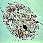 Grinje se pod mikroskopom na komadiću ljepljive trake mogu lijepo uočiti. |